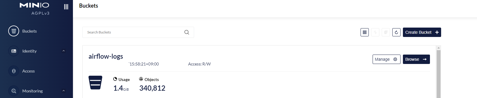 MinIO에서 Bucket 을 생성했고, (airflow-logs) User('test') 생성 및 권한도 부여되었다. (지난번 MinIO 초기 구성 포스팅 참조)