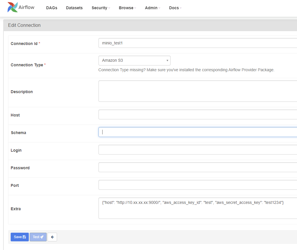 Extra : {"endpoint_url": "http://10.xx.xx.xx:9000/", "aws_access_key_id": "test", "aws_secret_access_key": "test1234"}