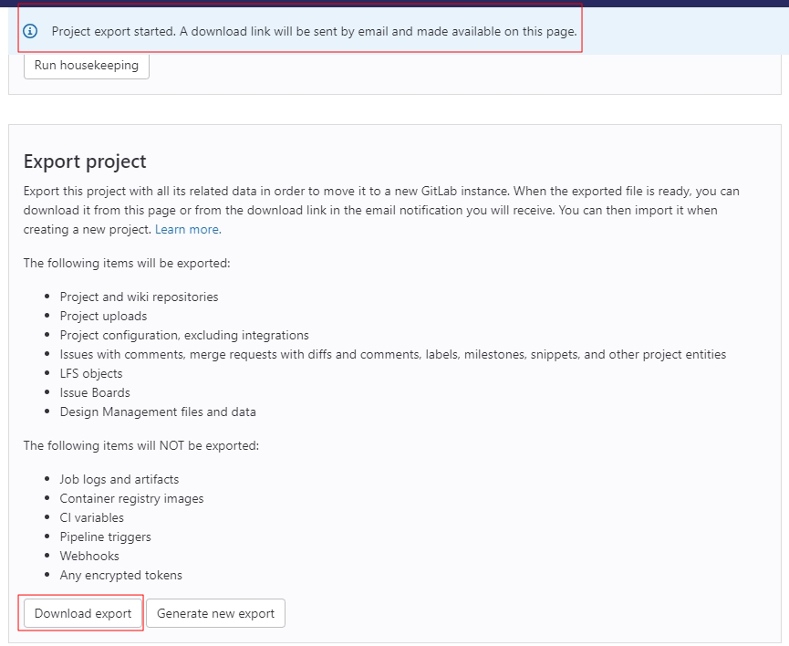 2. Advanced 메뉴에서 'Export project' 버튼이 'Download export' 버튼으로 변경되어 클릭으로 파일 다운로드 받아도 된다.